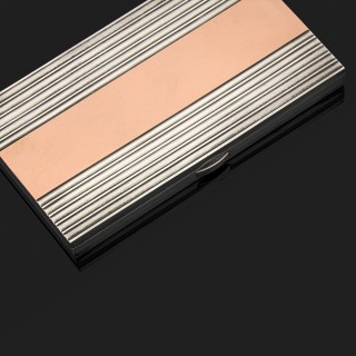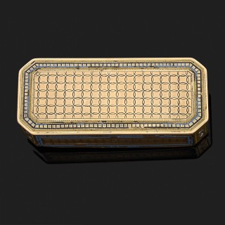 Boite rectangulaire à pans coupés en or jaune 18k, 750‰ à décor guilloché et gravé. Les bordures ornées de filets d'émail bleu (acci...