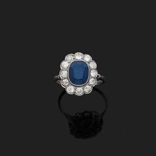 Bague en or jaune 18k, 750‰ et platine 850‰ ornée d'un rubis ovale dans un double entourage de diamants taillés en rose Années 1910.