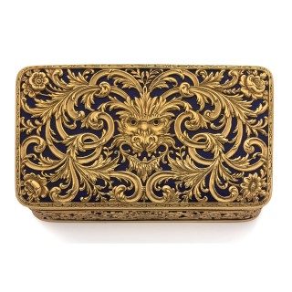 Boite rectangulaire en or jaune Bas Titre (poinçon ET) à décor "au Bérain" entièrement ajouré et ciselé sur fond d'émail bleu transl...