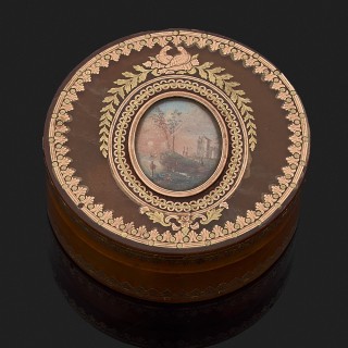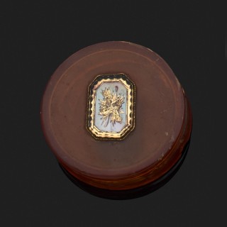 Boite ronde en écaille blonde cerclée d'or à décor de couple en fixé sous verre (accidents). Poinçon tête de coq. Début XIXe siècle....
