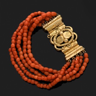 Bracelet composé de cinq rangs de boules de corail facettées, le fermoir en or jaune 18k, 750‰ ciselé. (Chocs)Epoque Napoléon III