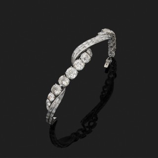 Bracelet torsadé en platine 850‰ orné de lignes sinueuses serties de diamants ronds (TA) et de diamants taille baguette.Années 1970