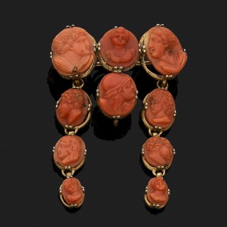 Broche en argent 800‰ doré à pampilles orné de dix camées sur corail de taille dégressive représentant des personnages en buste. Tra...