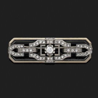 Broche plaque à décor géométrique en or gris et platine ornée de diamants taille ancienne et taille 8/8.Années 1930.