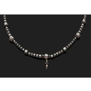 Collier de 116 perles probablement fines en chute. Fermoir tonneau en or gris serti de diamants taillés en rose.Longueur: 43 cm