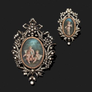 Ensemble en argent 800‰ et or 18k, 750‰ orné de miniatures à sujets d'enfants composé d'uneBroche à médaillon ovale porte-souvenir, ...