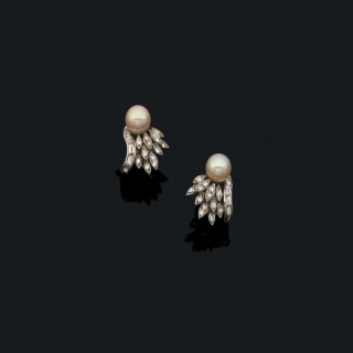 Paire de boucles d'oreille de forme volute en or gris 18 k (750‰) et platine, chacune ornée d'une perle de culture surmontée de diam...