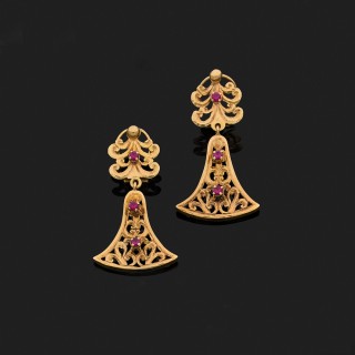 Paire de pendants d'oreilles articulés en or jaune 18k, 750‰ ajouré ornés de pierres rouges.Hauteur : 4,8 cm
