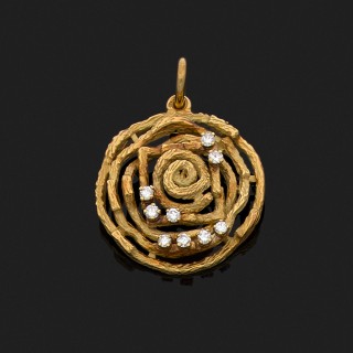 Pendentif articulé en or jaune émaillé polychrome rehaussé de petits diamants taillés en rose. Il est orné d'un profil de femme dans...