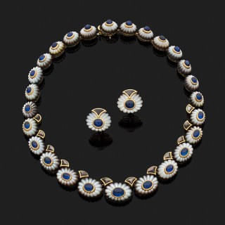 TABBAH.Parure "fleurs" en or jaune 18k, 750‰ orné de nacre et de cabochons de saphir. Elle se compose d'un collier et d'une paire de...