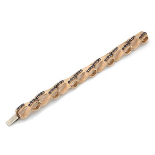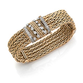 • Articulated ribbon bracelet in 18K satin yellow gold (585‰) with seven interlocking motifs adorned with