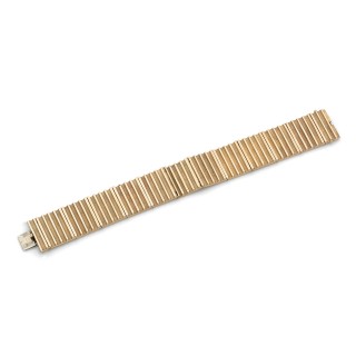 • Ribbon bracelet in 18K smooth and satinated yellow gold (750‰) with 12 articulated fluted motifs, one of