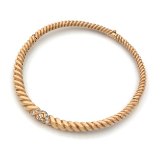 Rigid necklace in 18K coiled yellow gold (750‰), adorned with diamonds in the center