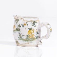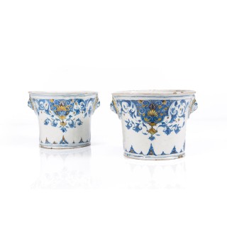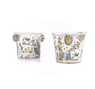 MidiPaire de rafraîchissoirs à décor polychrome de lambrequins, les prises en forme de mascarons.XVIIIe siècleH.15 cm(L’un restauré)