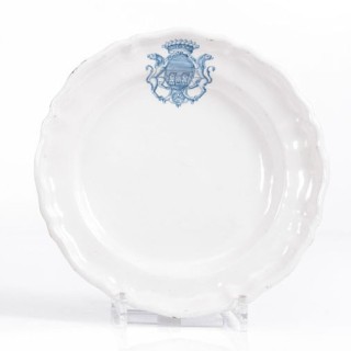 MoustiersAssiette à décor en camaïeu bleu d’une chasse au sanglier d’après Tempesta, rinceaux feuillagés sur le bord.XVIIIe siècleØ ...