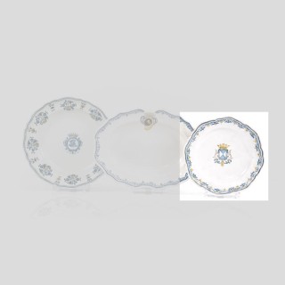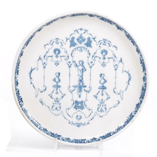 MoustiersPlateau circulaire à décor en camaïeu bleu dans le style de Berain au centre d’amour et buste de fleurs dans des encadremen...