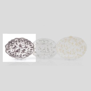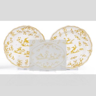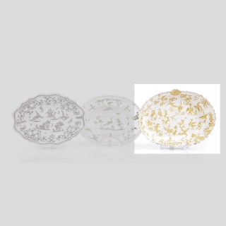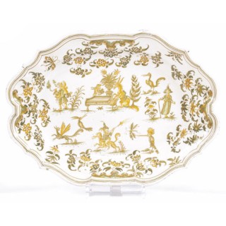 MoustiersGrand bassin ovale à bord contourné à décor en camaïeu vert et orangé de nombreuses figures sur terrasse.XVIIIe siècleL.42 ...