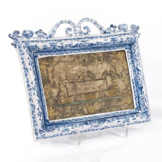 MoustiersCadre rectangulaire en faïence à décor en camaïeu bleu de rinceaux feuillagés encadrant une broderie datée 1731 à l’encre a...