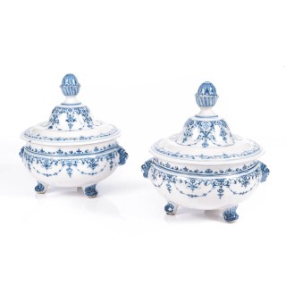 MoustiersPaire de pots à oille ronds couverts à décor en camaïeu bleu de guirlandes et rinceaux feuillagés.XVIIIe siècleH.26 cm(Rest...