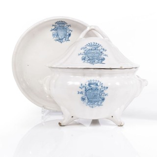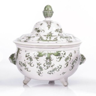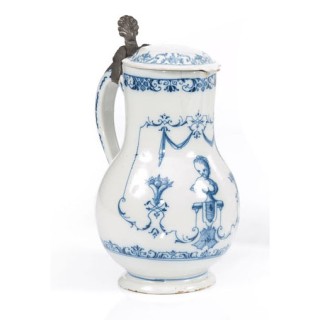 MoustiersPot à eau couvert à décor en camaïeu bleu dans le style de Berain de buste de femme sur console et vases fleuris dans un en...