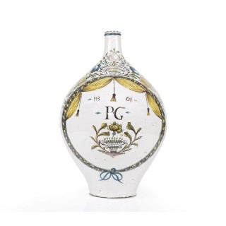NordGrand pichet ovoïde à décor polychrome de corbeilles fleuries, la date 1801 et le monogramme PG encadré de draperies suspendues ...
