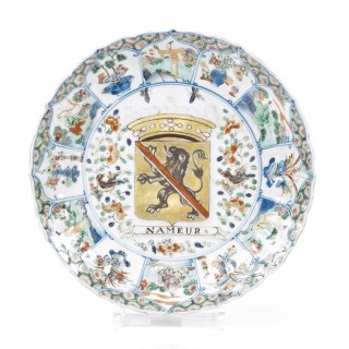 ChineCoupe ronde à décor polychrome des émaux de la famille verte au centre des armes de la ville de Namur dans un écu cerné d’oisea...