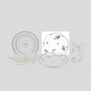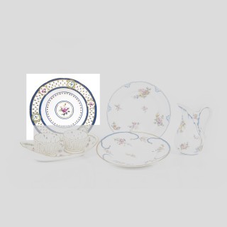 SèvresAssiette à groseilles en porcelaine tendre à décor polychrome de semis de bouquets de fleurs et palmes bleues sur l’aile.Marqu...