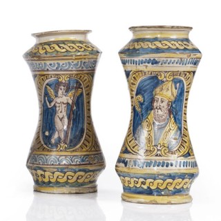SicileDeux albarelli cintrés à décor polychrome d’un évêque et d’un ange tenant une croix dans des médaillons sur fond de trophées.X...