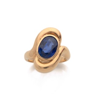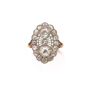 Oval-shape festooned ring in platinum and 18k yellow gold It is adorned with two circular-cut diamonds (approximately 0,50 carats each) in