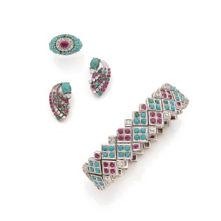 Demi-parure in 18k (rhodium plated) yellow gold (750‰) adorned with rubies, diamonds and turquoise cabochons It is composed of a flexible ribbon bracelet