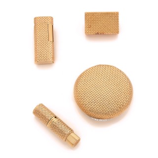 VAN CLEEF & ARPELS Beauty set in 18k yellow gold (750‰) wickerwork composed of a round powder case, its grip enhanced with diamonds, a