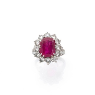Marguerite ring in platinum (850‰) adorned with a facetted oval ruby weighting 4,5 carats approximately, in a surrounding of 12 round d