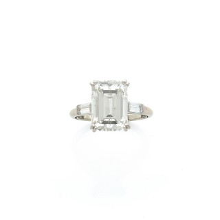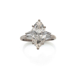 Ring in 18k grey gold (750‰) adorned with a marquise-shaped diamond of 3,29 carats flanked by six tapered-baguette diamonds EU ring si