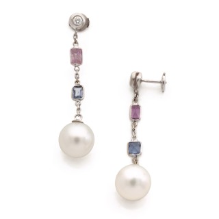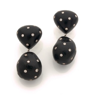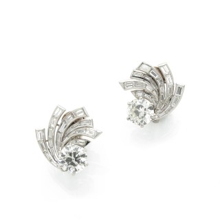 Pierre STERLÉ Pair of ear clips "Feuilles" in 18k grey gold (750‰) and round and baguette-cut diamonds, each adorned with a cultured pearl