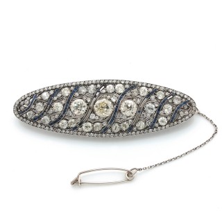 Large oval-shape brooch entirely paved with circular-cut diamonds and adorned with sinuous lines set with calibrated sapphires (some of