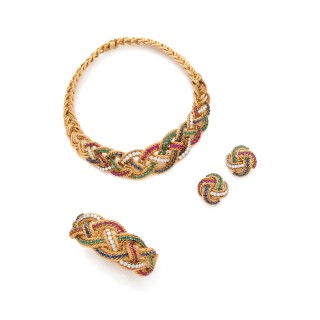 BOUCHERON, Paris Set in 18k yellow gold (750‰) and platinum (850‰) woven, rubies, emeralds, sapphires and diamonds. It is composed of a