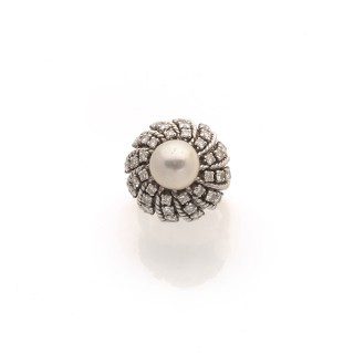 Ring in 18k grey gold strings (750‰) with a revolving movement adorned with a pearl, probably fine French production from the 1950s-60