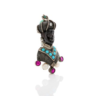 G. NARDI "Tête de Maure" clip in 18k grey gold (750‰) partially blackened enhanced with turquoise cabochons, close-set round rubies and