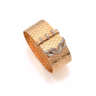 Flexible ribbon bracelet in 18k yellow gold (750‰) and platinum (850‰) with a plate pattern adorned on the end with a festooned design