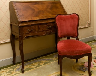 Writing table, chair, mirror, lamp and armchair