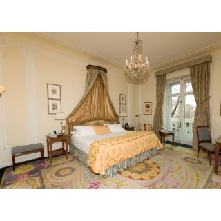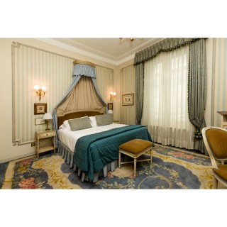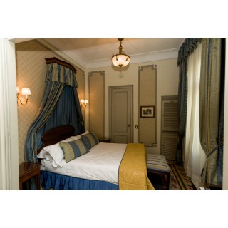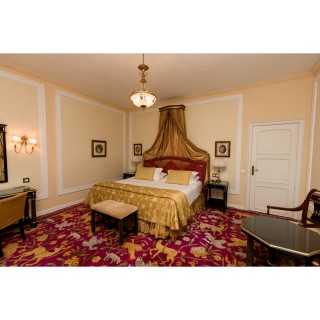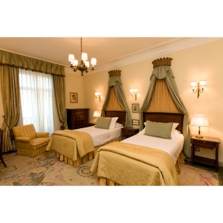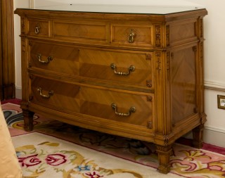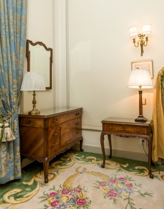 Headboard, 110 x 190 cm, two night tables 74 x 47 x 37 cm, two lamps, H 50 cm, bedcover, curtains, small rectangular table 65 x 60 x 45 cm