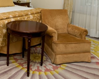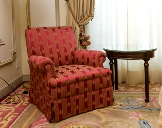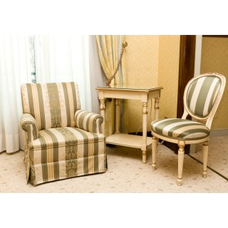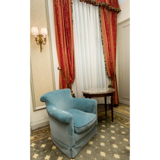 Armchair, coffee table with marble top and curtains