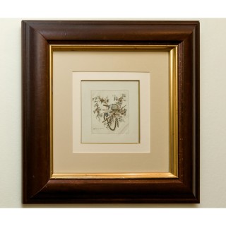 Etching (flowers), 50x35 cm and pair of etchings (horsemen), 40x
