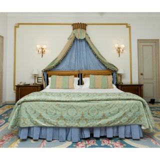 Headboard, canopy, curtains, two night tables and stool
