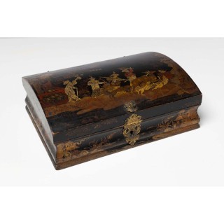 Wooden chest box covered with black and gold Chinese lacquer decorated with a hunting scene Gilt bronze clasp and grip