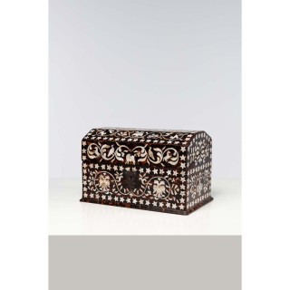 Rectangular chest with cut-side lid Solid wood core covered with tortoiseshell veneer on all sides inlaid with mother-of-pearl elements