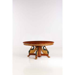 Large oval mahogany, painted and gilded wood dining table, the banded belt decorated with a frieze of oak leaves, resting on swan-neck