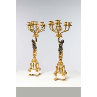 Pair of patinated bronze and gilt bronze candelabras with childr ...