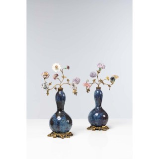 Pair of blue shaded porcelain vases (China?) surmounted by polychrome porcelain bouquets of flowers European chased and gilt bronze mou