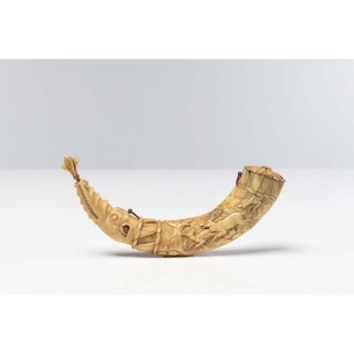 Ivory powder flask carved in bas-relief with hunting scenes.